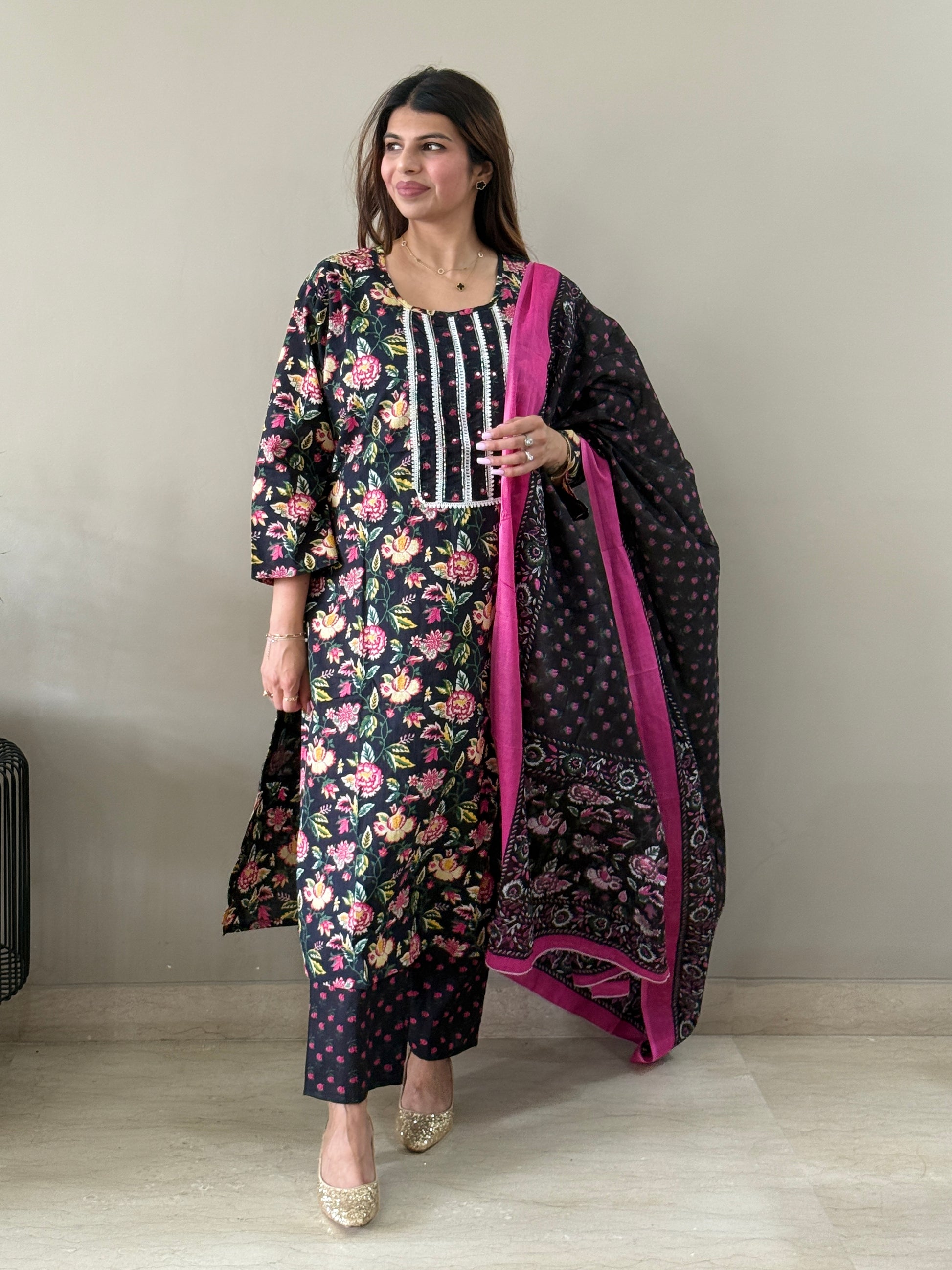 Elegant Black Floral Cotton Suit Set featuring intricate lace detailing on the yoke. Crafted from soft, breathable cotton fabric, this set includes a beautifully printed kurta with a comfortable lining for added ease. Perfect for both casual outings and semi-formal gatherings, offering a blend of comfort and style