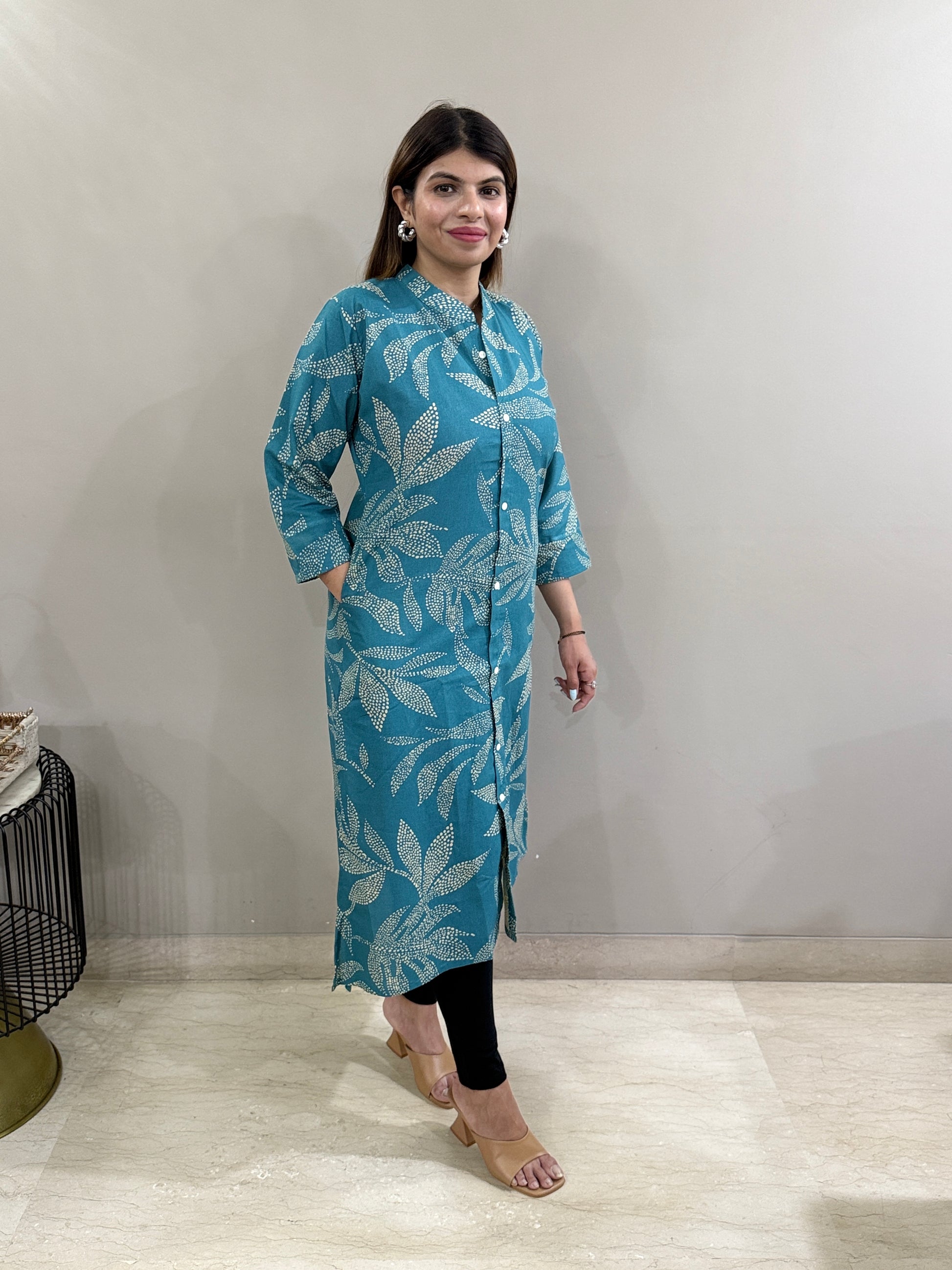 A comfortable blue floral flex cotton kurti in an A-line silhouette, featuring a charming floral print. The addition of pocket enhances both practicality and style, making it a perfect blend of fashion and functionality for casual outings or relaxed gatherings. The soft, breathable fabric ensures comfort all day long, while the vibrant design adds a fresh, lively vibe to your wardrobe.