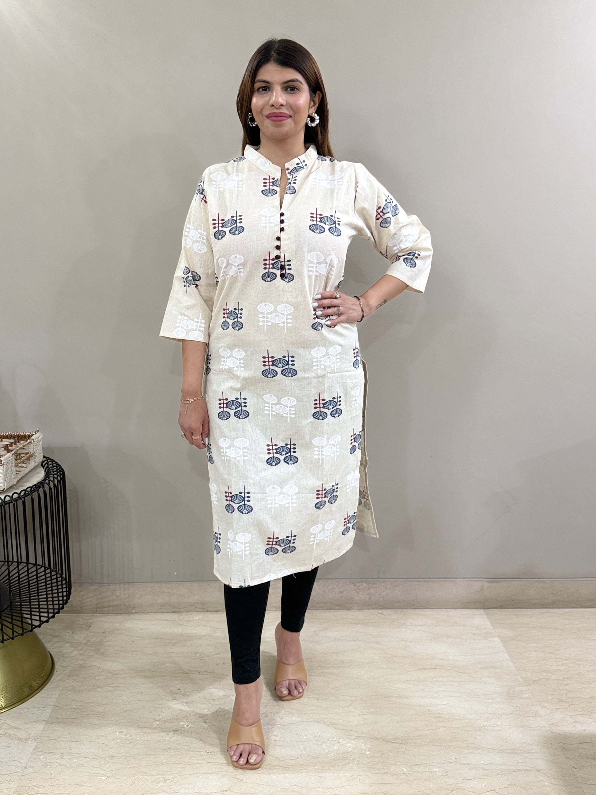 A stylish flex cotton kurti featuring a vibrant floral print with a beautiful blend of blue, white, and red flowers. The soft, breathable fabric ensures comfort, making it an ideal choice for casual wear or a day out, while the colorful pattern adds a fresh and lively touch to your wardrobe.