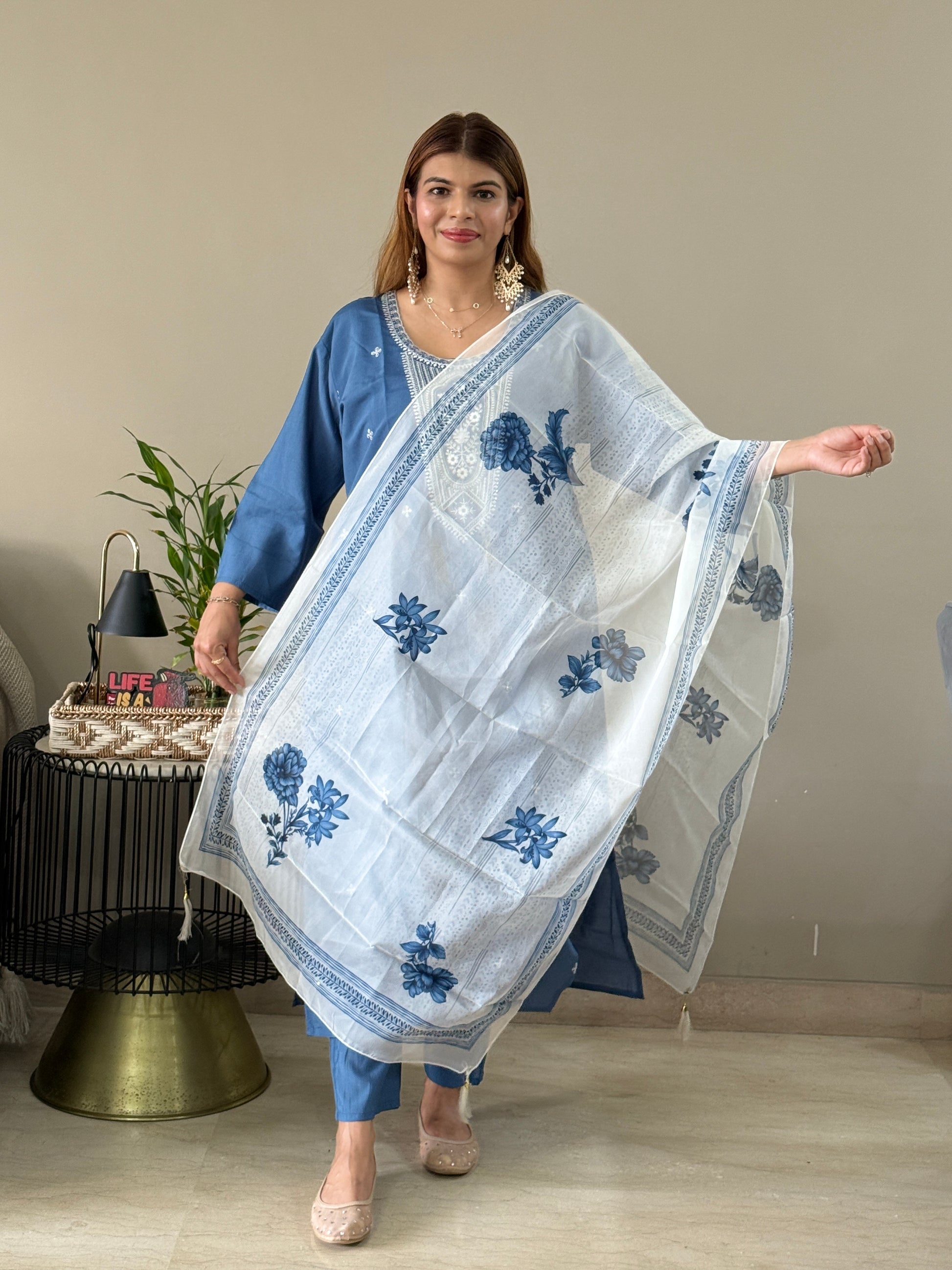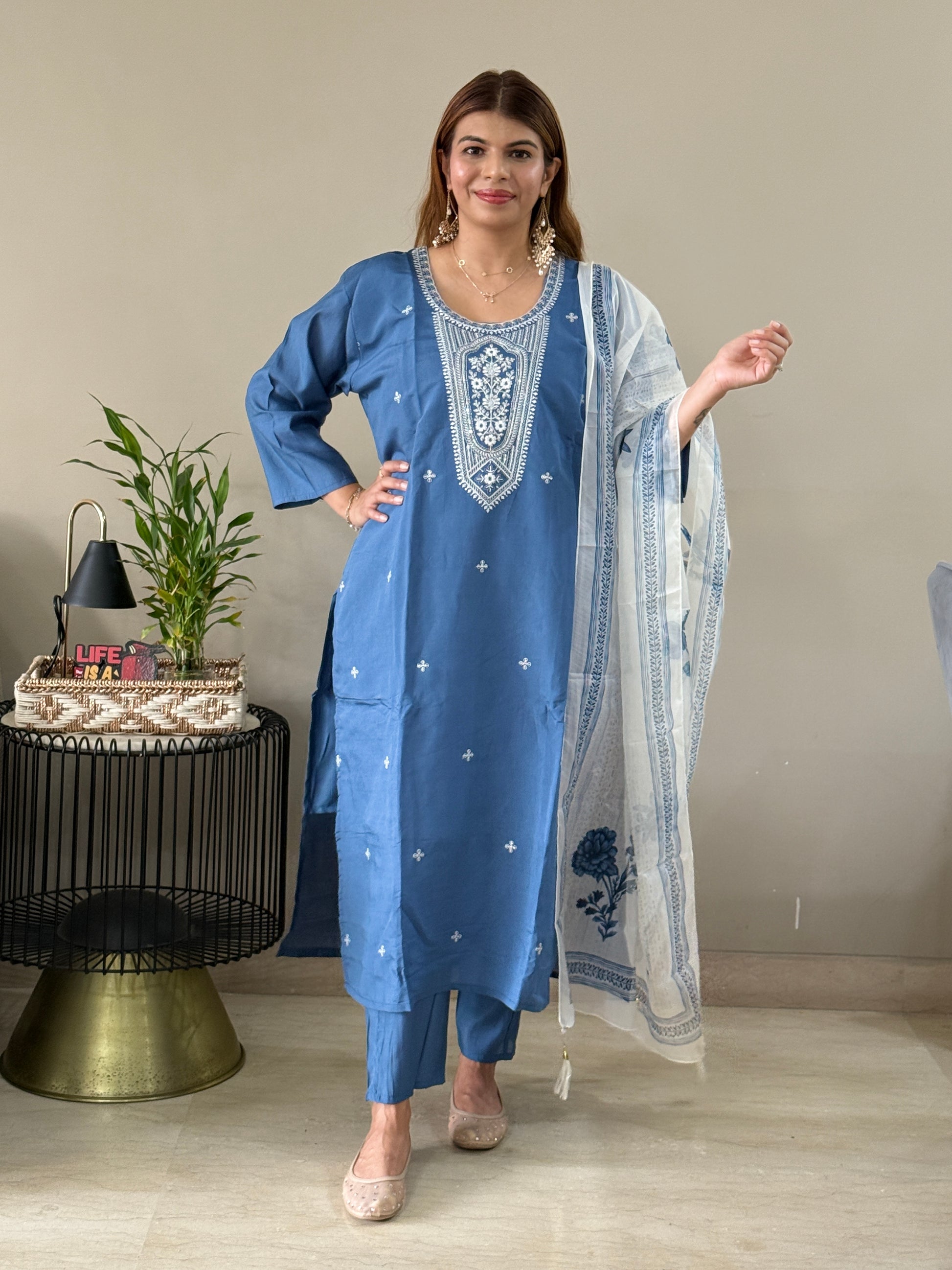 Step into understated elegance with this beautiful light navy blue suit set, crafted from smooth and luxurious Roman silk. The highlight of the ensemble is the intricate white embroidery on the yoke, adding a refined and graceful touch to its minimalist design. Lightweight yet rich in appearance, it comes with a soft inner lining for all-day comfort. Perfect for festive gatherings, cultural celebrations, or special occasions—this suit set effortlessly blends sophistication with tradition.