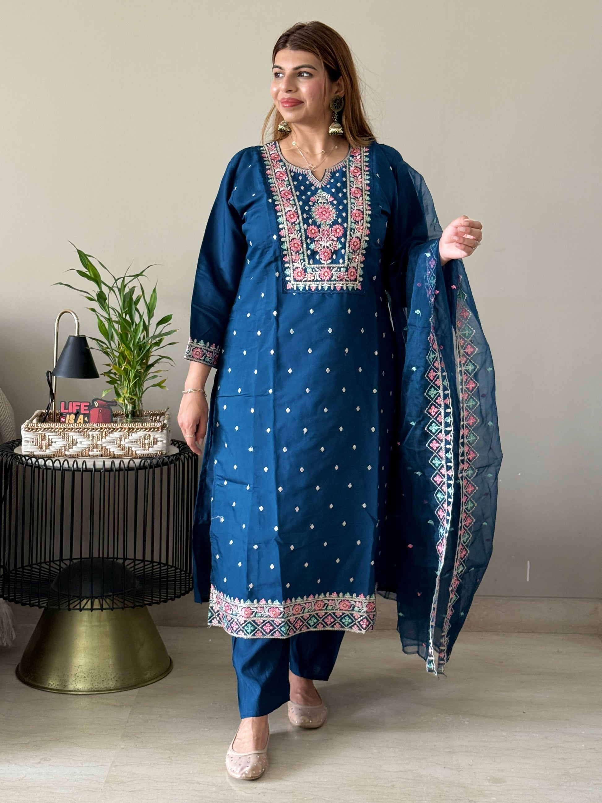 Make a lasting impression this festive season with this beautiful navy blue suit set, crafted in luxurious Roman silk. The ensemble is embellished with shimmering sequin detailing and intricate golden embroidery spread gracefully across the suit—adding a perfect touch of elegance and festive sparkle. Designed with a smooth inner lining for comfort, this outfit drapes beautifully and feels as good as it looks. Ideal for weddings, festive celebrations, and evening functions, it's a timeless addition to your ethnic collection.