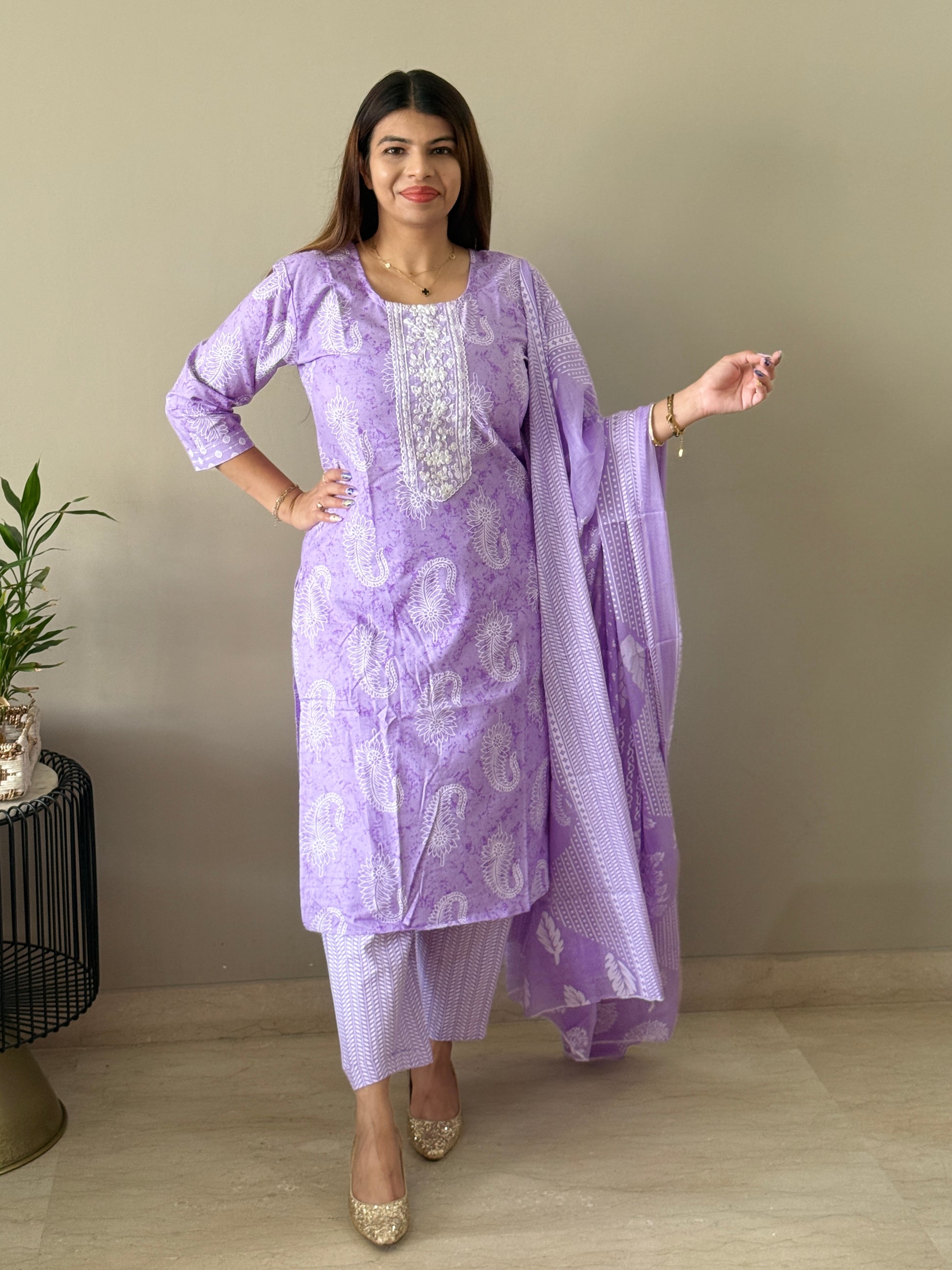 A purple cotton suit set featuring exquisite embroidery detailing around the neckline, offering a perfect blend of traditional charm and modern elegance. The intricate design adds a sophisticated touch, making it an ideal choice for any special occasion or formal event.