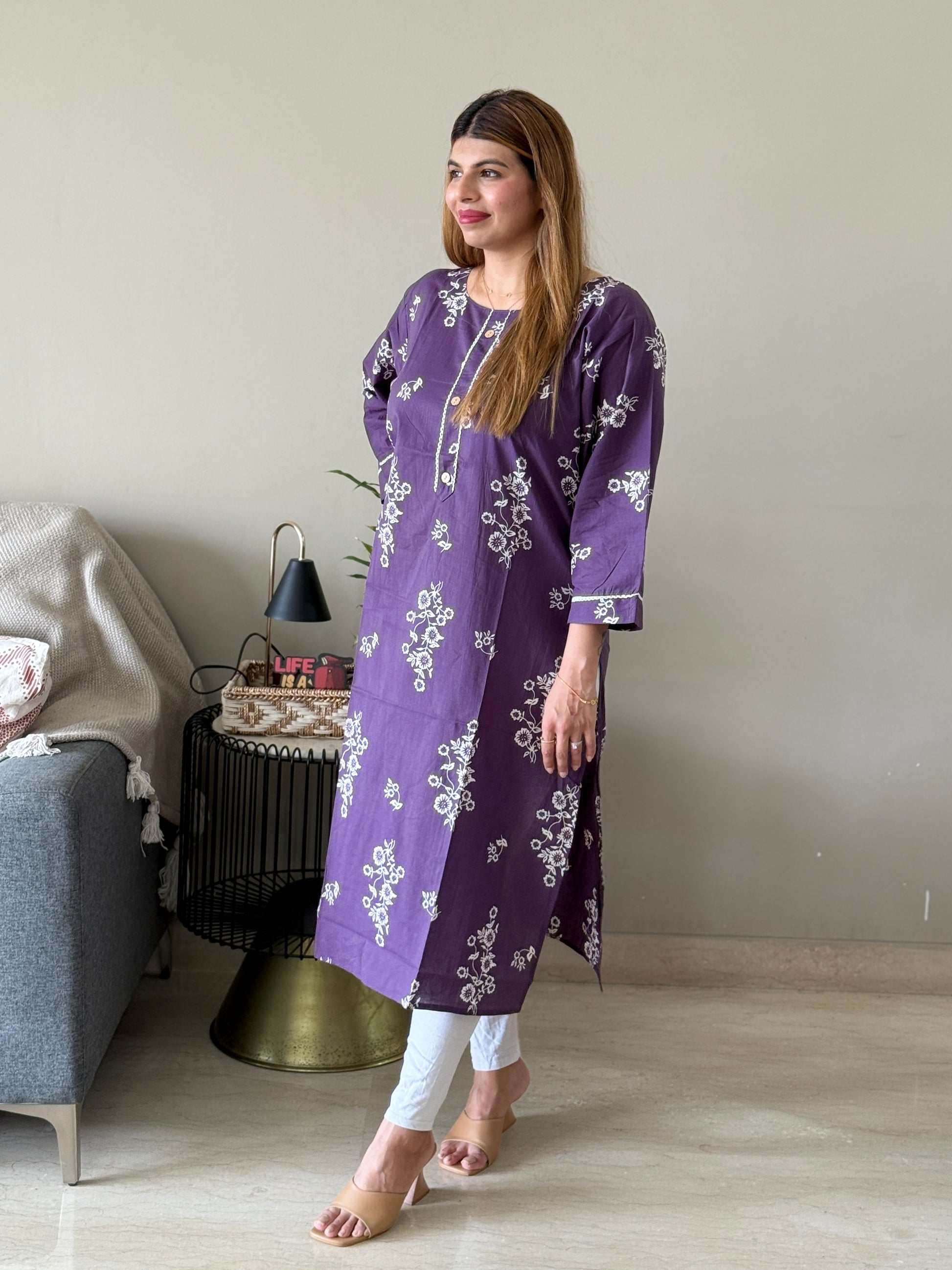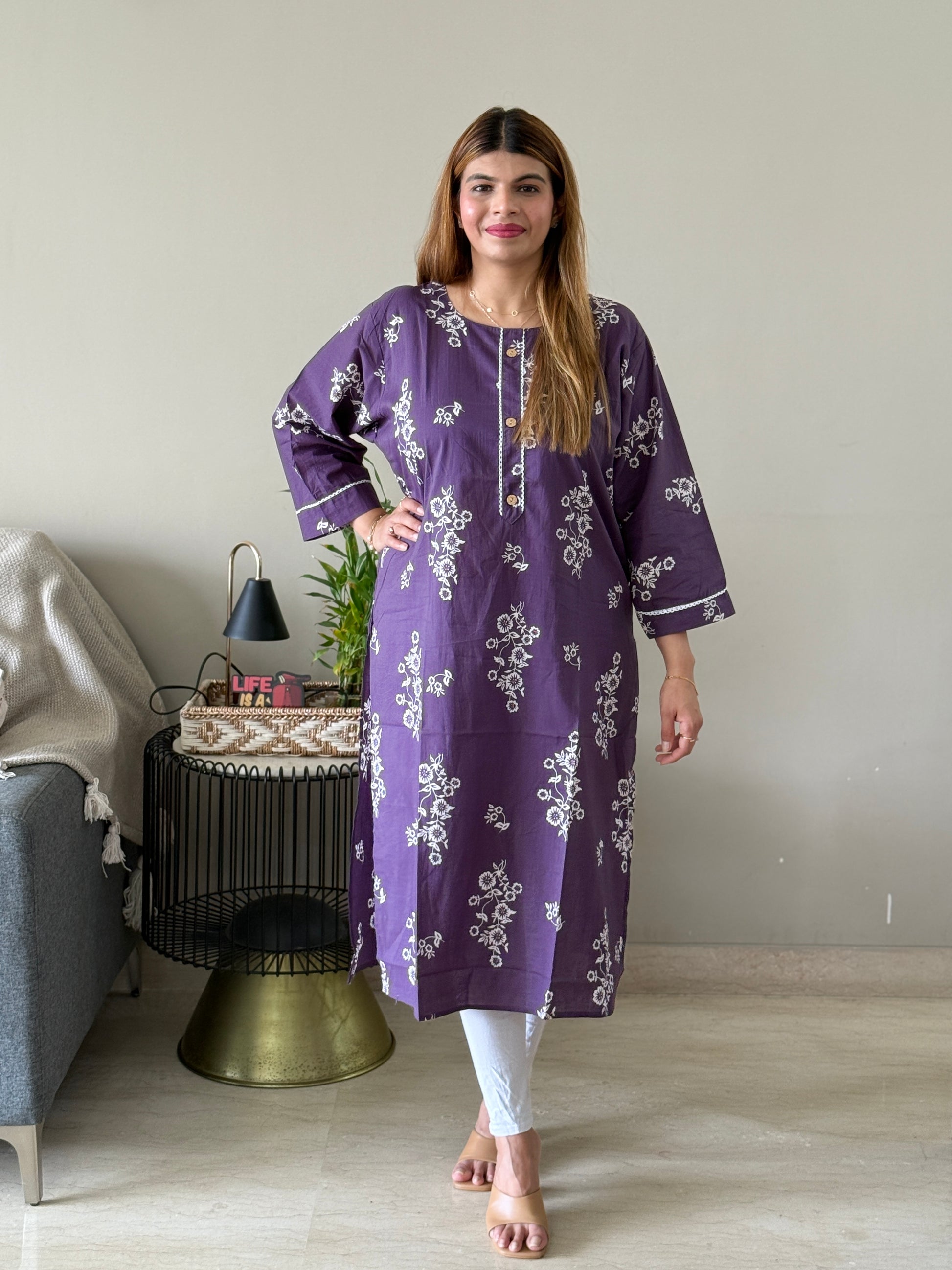 This elegant purple cotton kurti features a charming floral print, beautifully complemented by delicate lacework detailing on the yoke and sleeves. Crafted for both comfort and style, it effortlessly blends traditional aesthetics with a modern touch—perfect for everyday wear or casual outings.