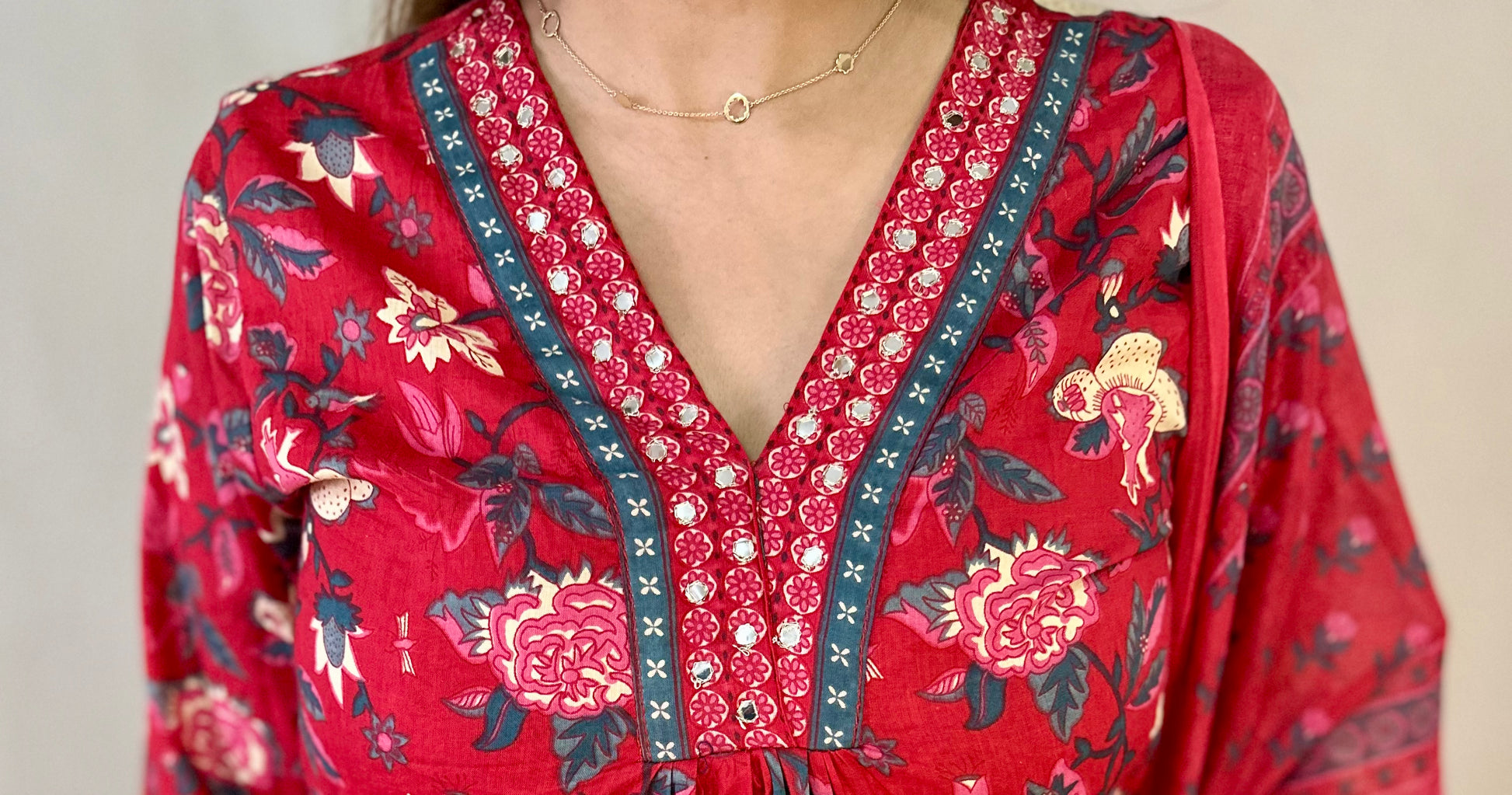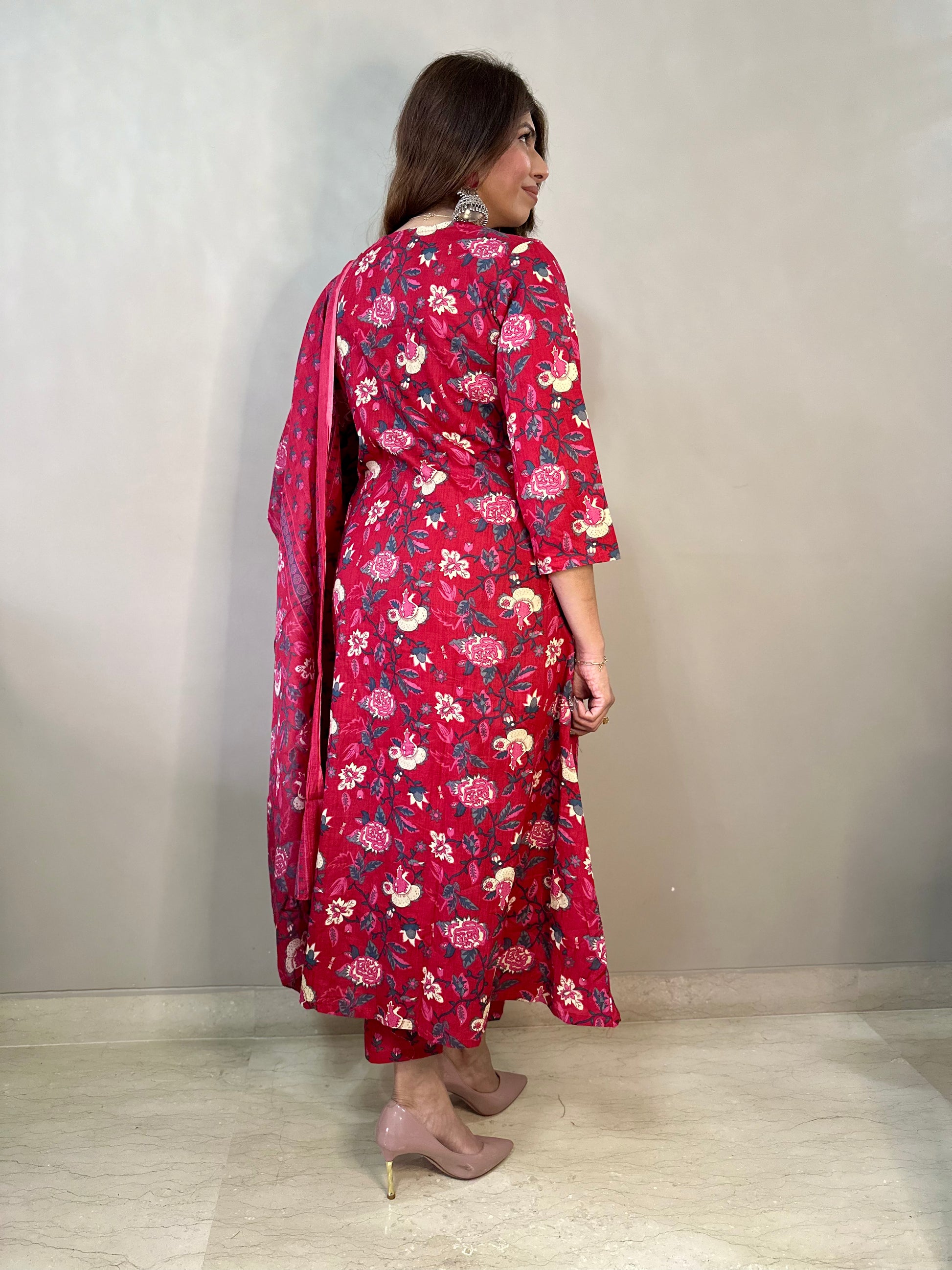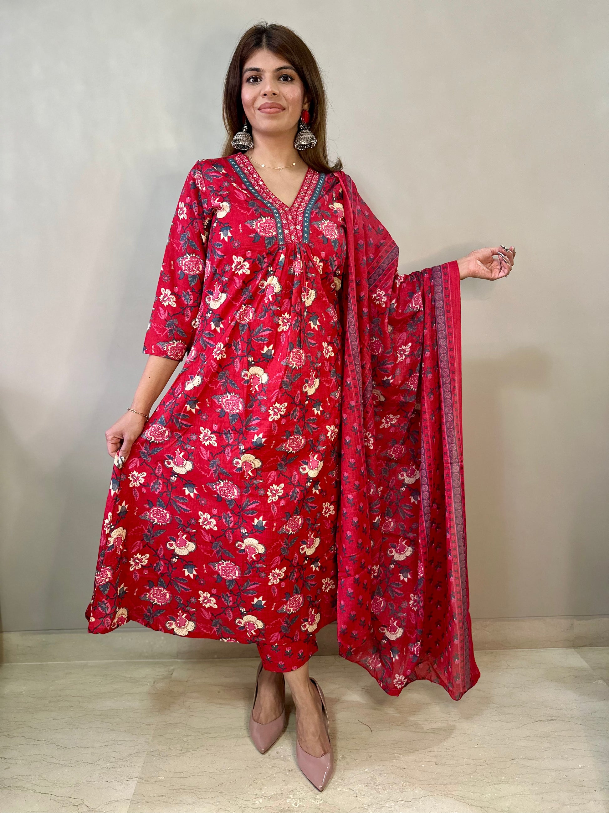 Floral Anarkali featuring a stylish V-neck, crafted from premium cotton. This piece showcases exquisite mirror detailing, a printed bottom with a convenient pocket, and comes with a stunning printed dupatta for an elegant touch.