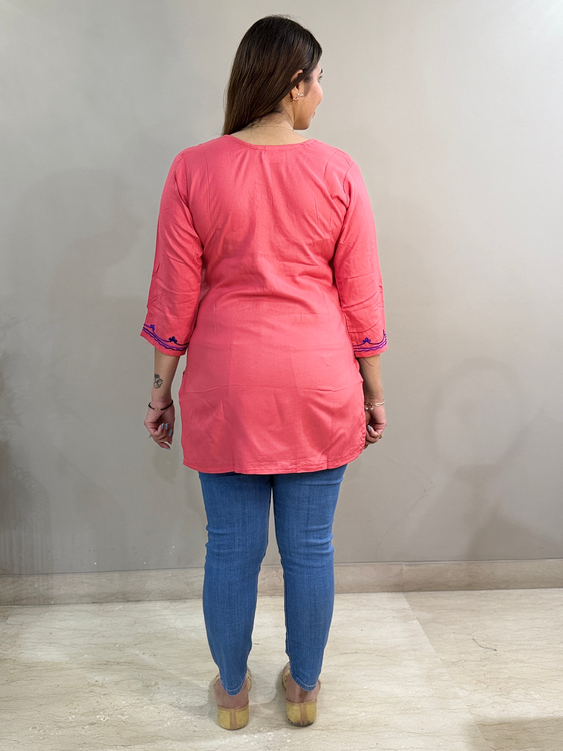 A vibrant salmon-colored kurti crafted from soft rayon fabric, featuring intricate blue embroidery along the neckline and hem. The lightweight, breathable fabric ensures comfort, while the detailed design brings an elegant, modern twist to a traditional look. Perfect for both everyday wear and special occasions
